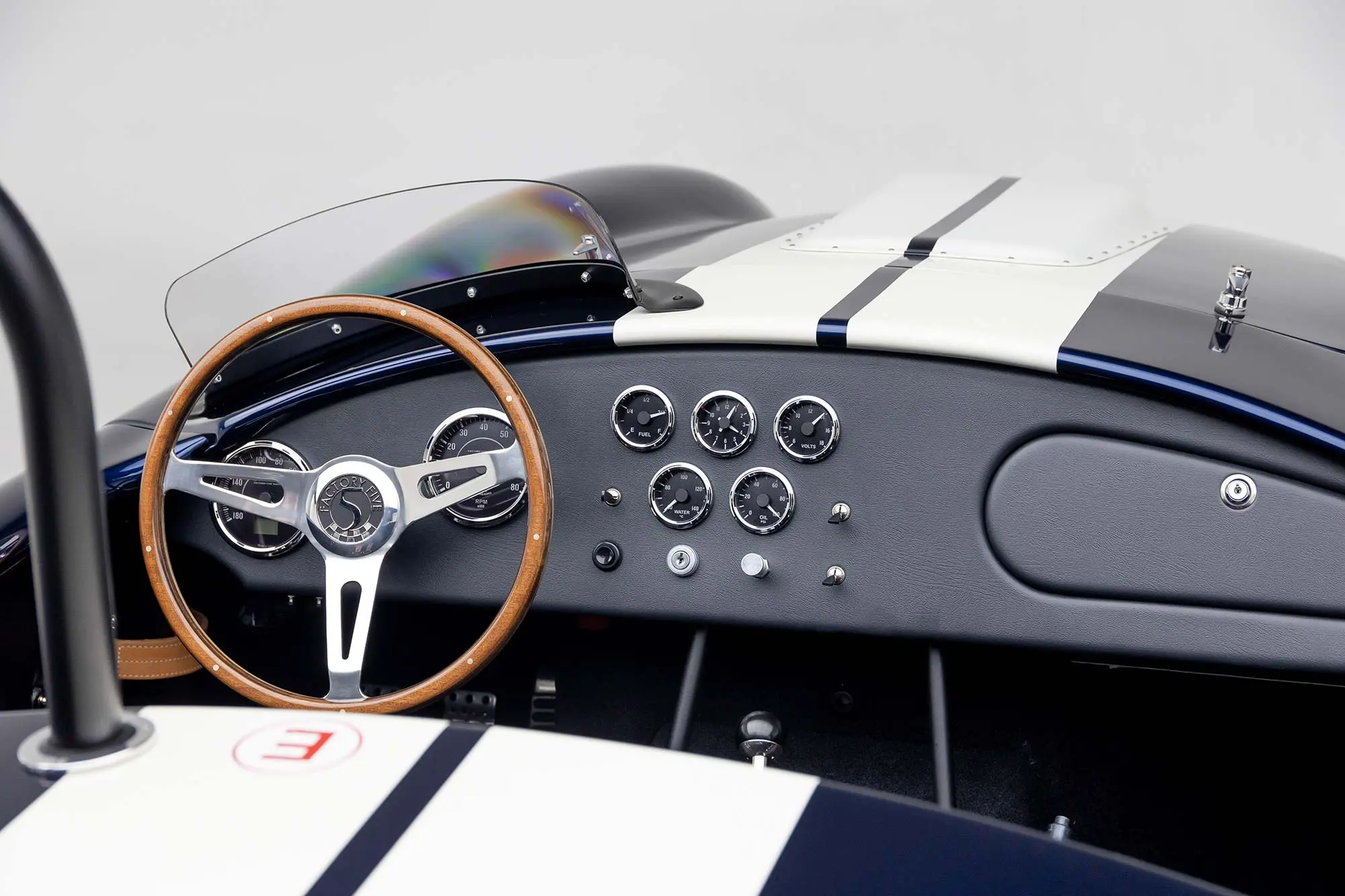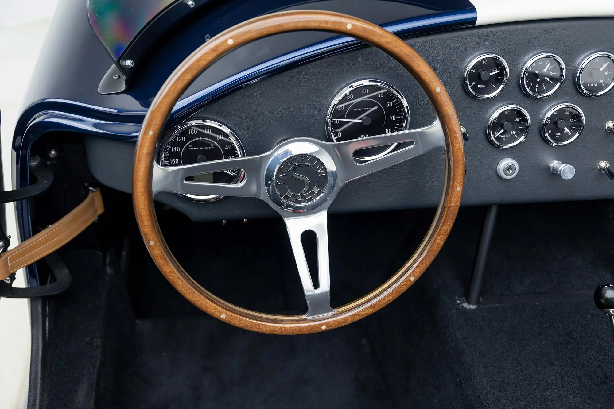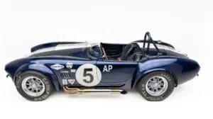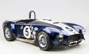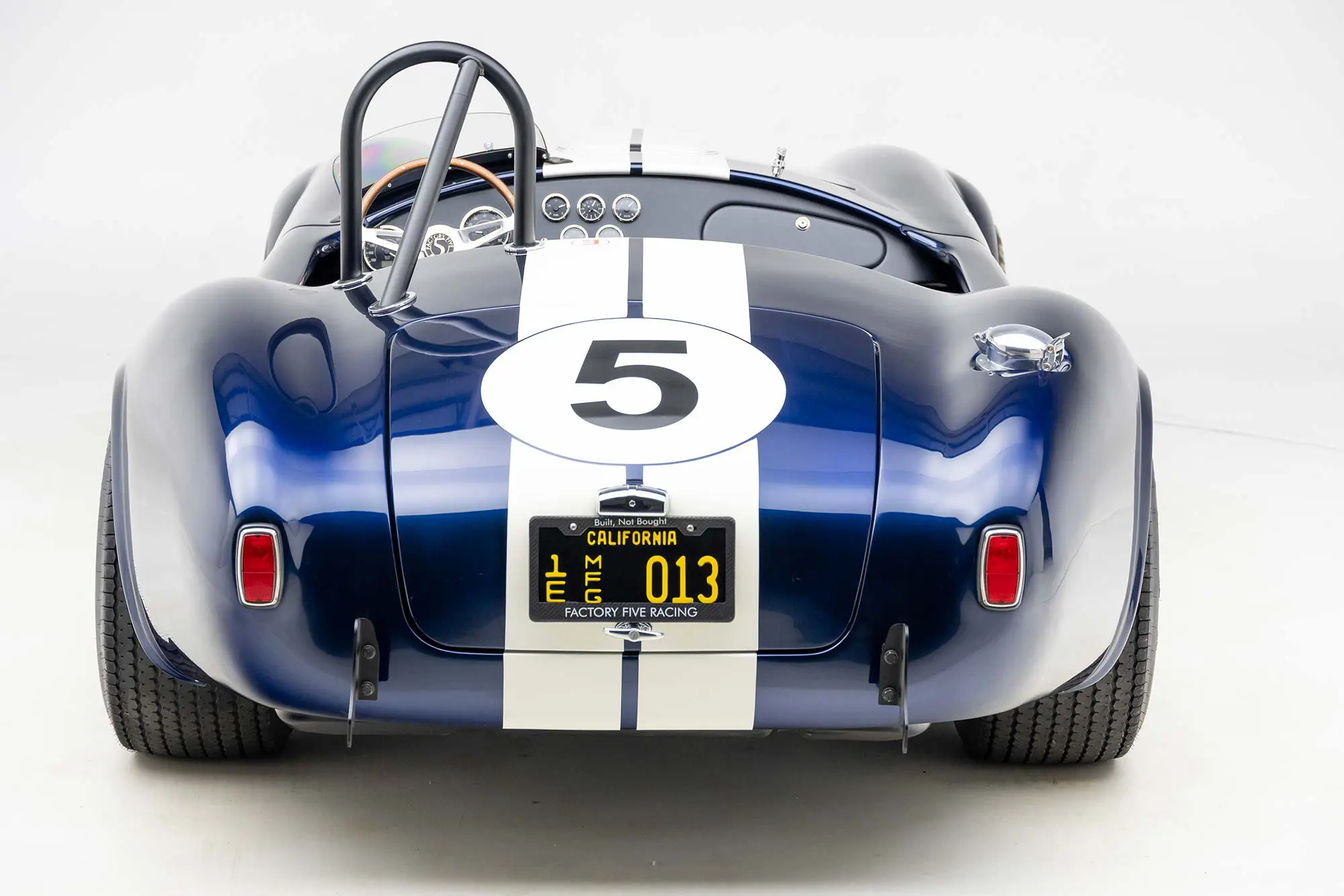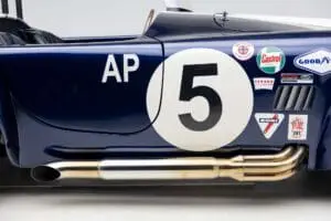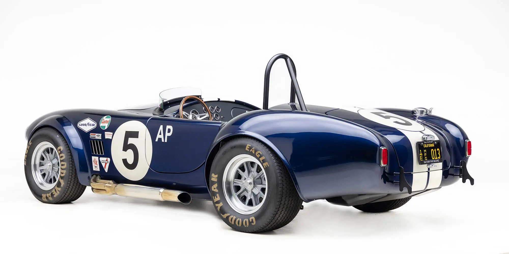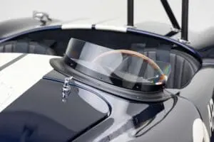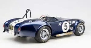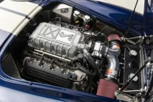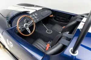 This Mk4 Roadster was featured at the 2022 SEMA Show, and uses a 750 HP Ford Predator engine. The Predator is the same 5.2L supercharged engine that powers the current Ford GT500. The car has modest options which include IRS, vintage 15″ Halibrand wheels and period-correct Goodyear tires, Factory Five vintage gauges, standard interior, and deep blue paint with Wimbledon white vintage stripe/gumballs.
