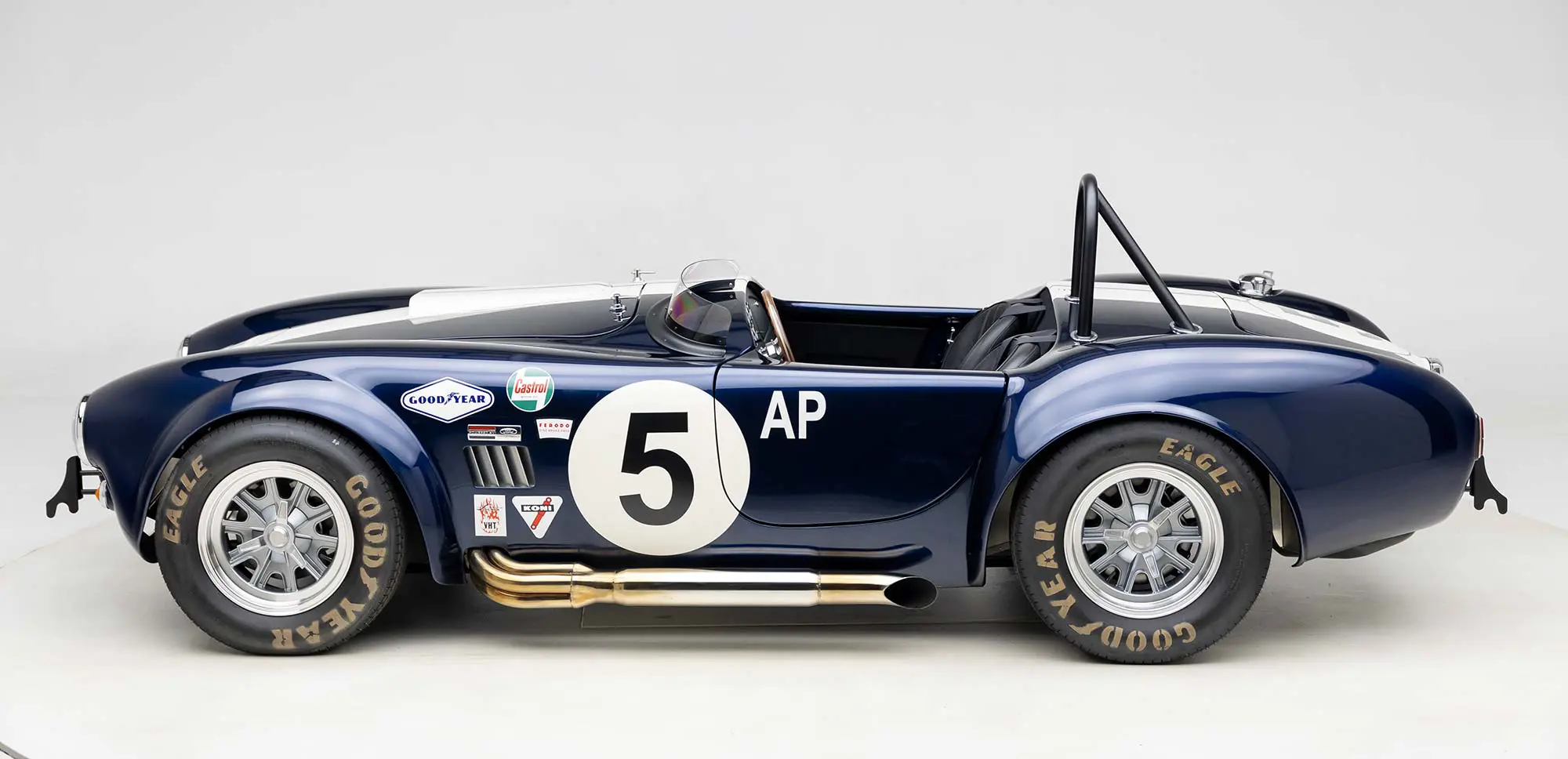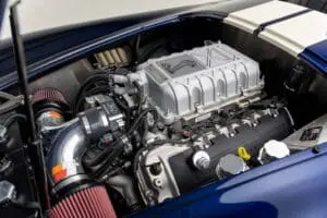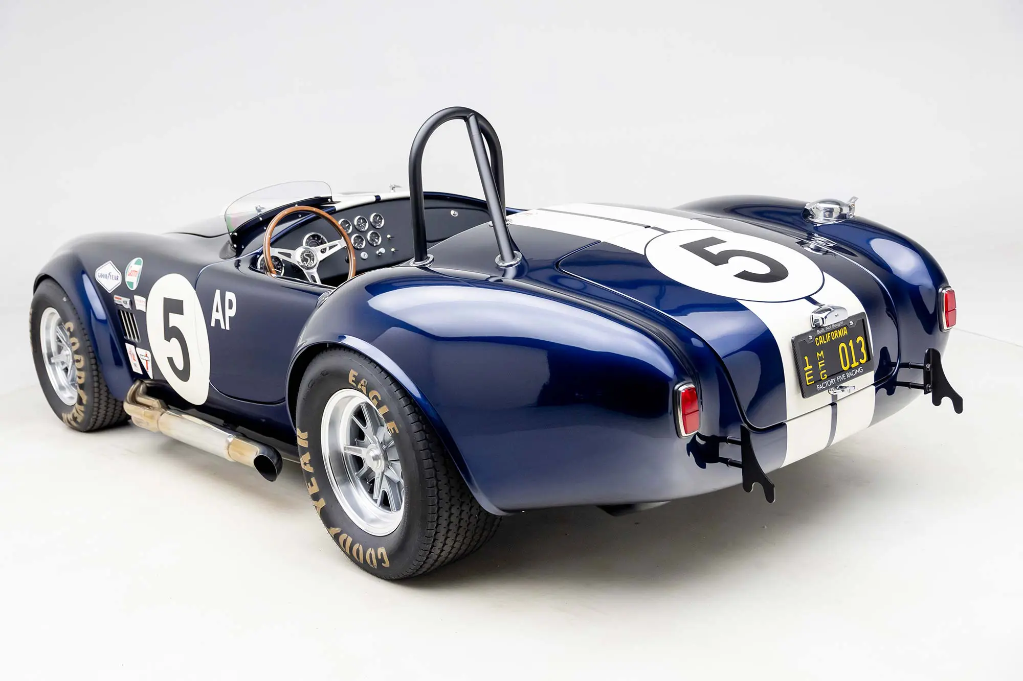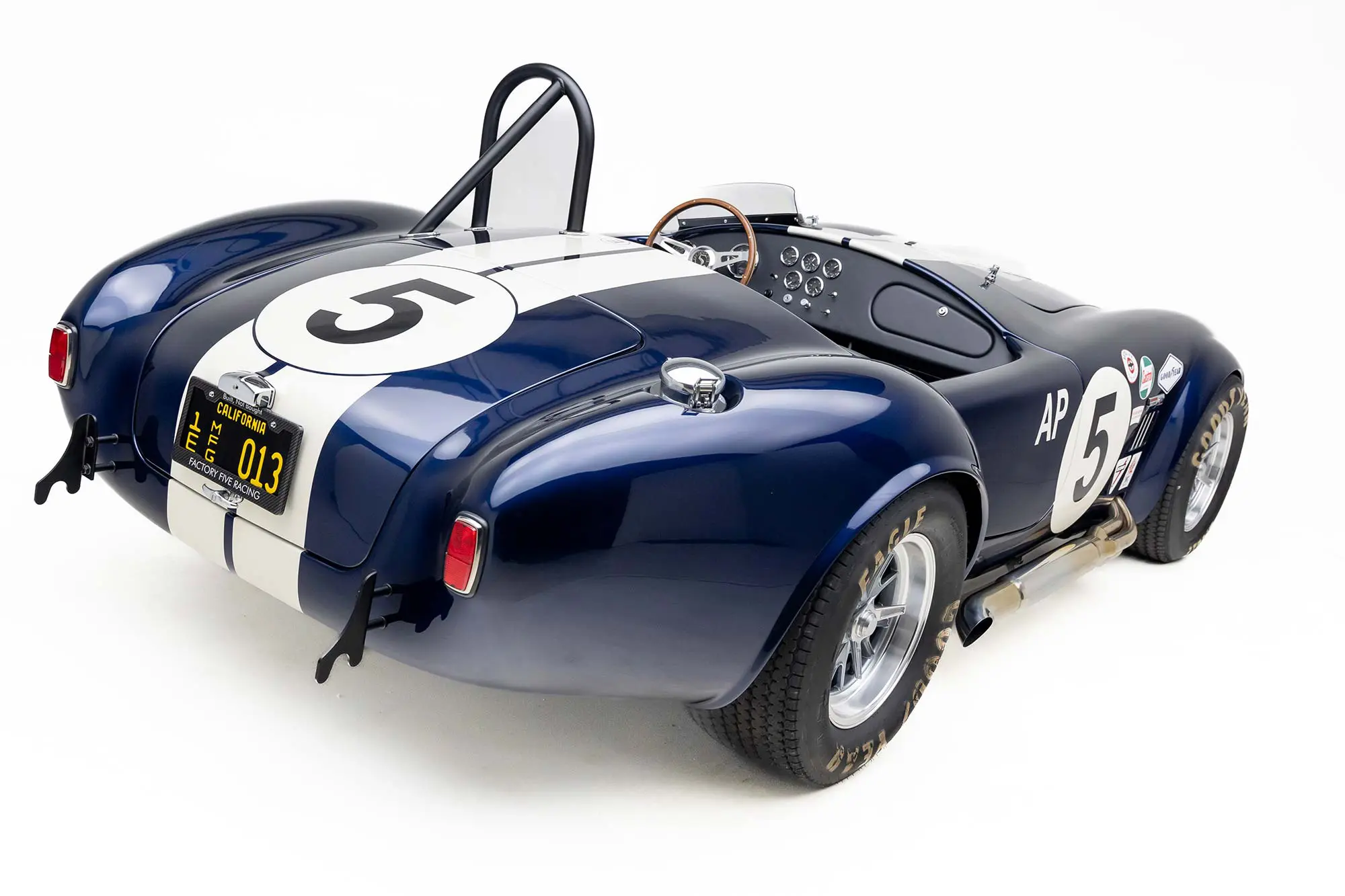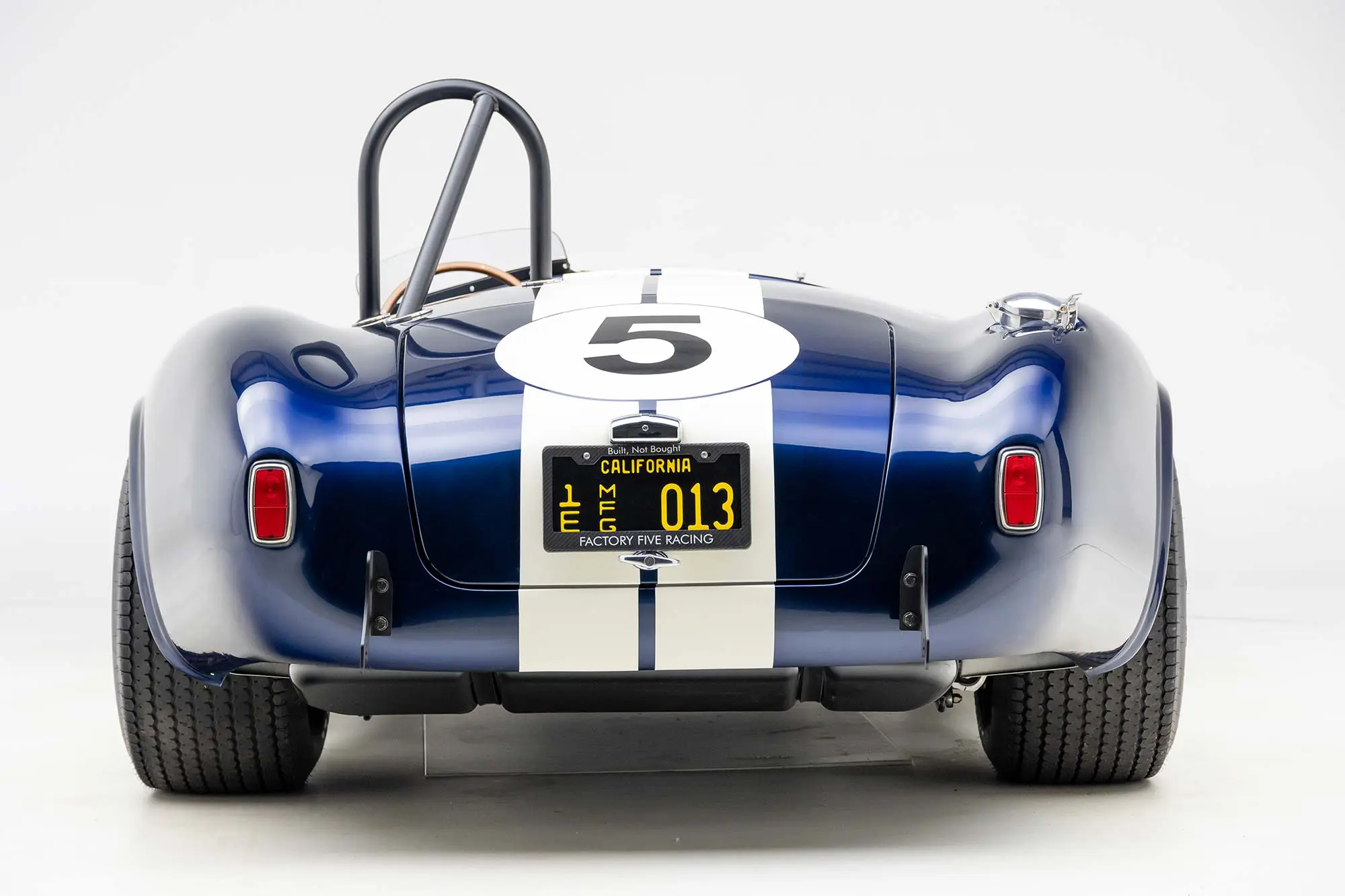 This Mk4 Roadster was featured at the 2022 SEMA Show, and uses a 750 HP Ford Predator engine. The Predator is the same 5.2L supercharged engine that powers the current Ford GT500. The car has modest options which include IRS, vintage 15″ Halibrand wheels and period-correct Goodyear tires, Factory Five vintage gauges, standard interior, and deep blue paint with Wimbledon white vintage stripe/gumballs.