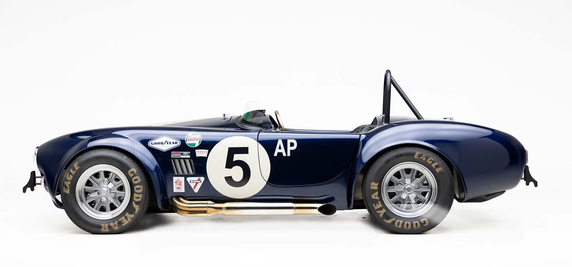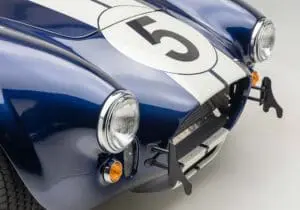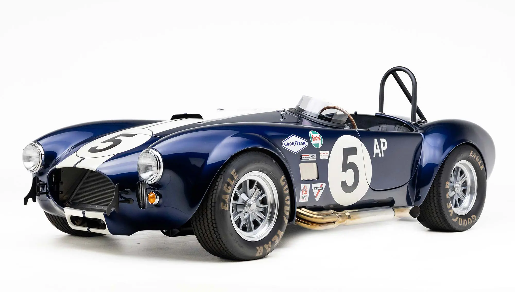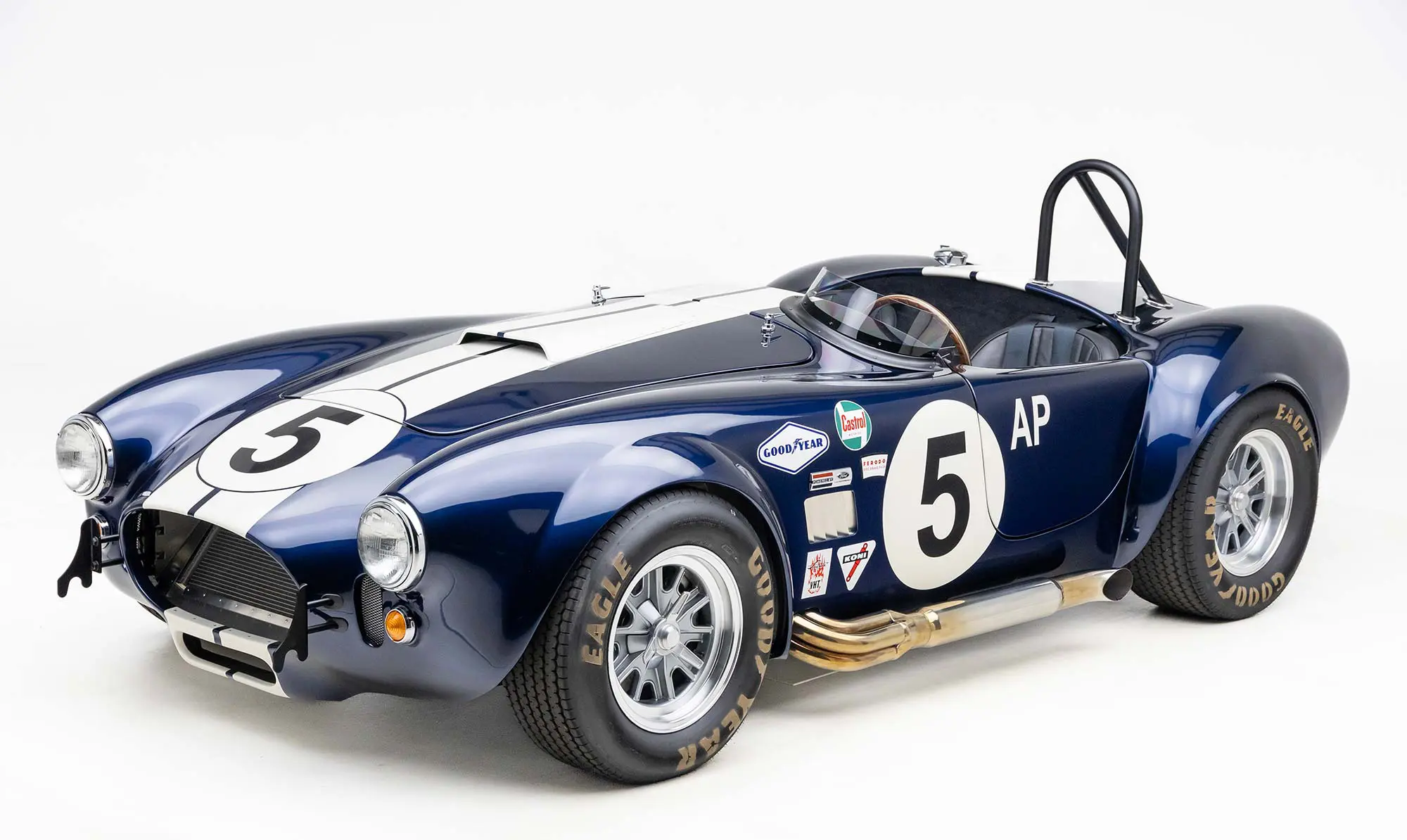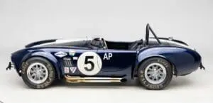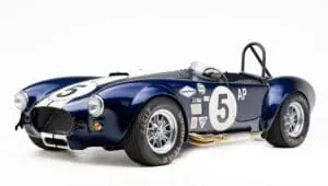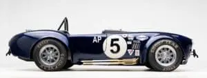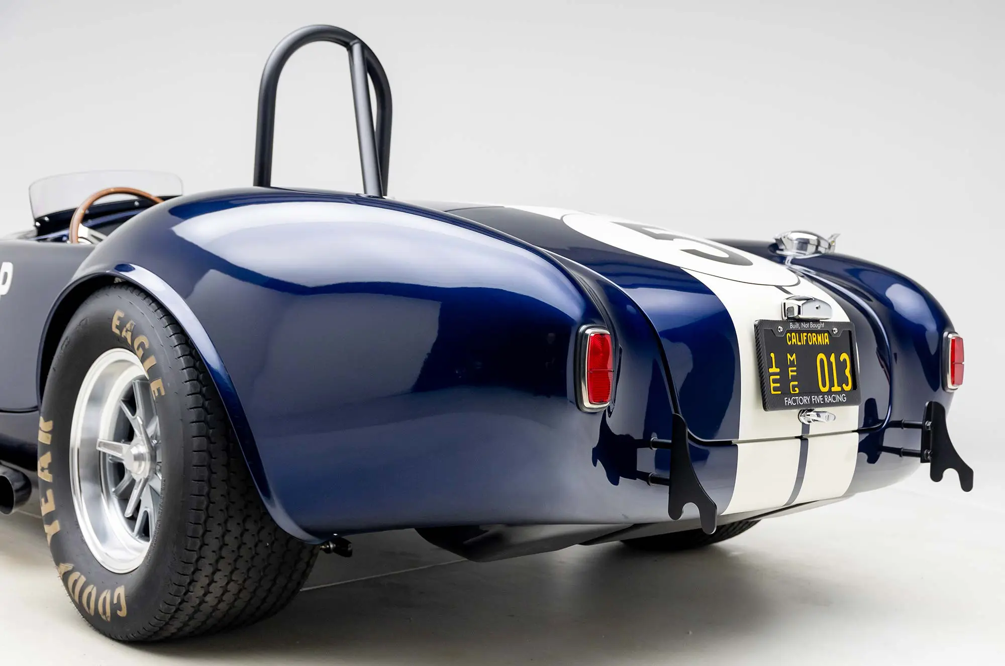 This Mk4 Roadster was featured at the 2022 SEMA Show, and uses a 750 HP Ford Predator engine. The Predator is the same 5.2L supercharged engine that powers the current Ford GT500. The car has modest options which include IRS, vintage 15″ Halibrand wheels and period-correct Goodyear tires, Factory Five vintage gauges, standard interior, and deep blue paint with Wimbledon white vintage stripe/gumballs.