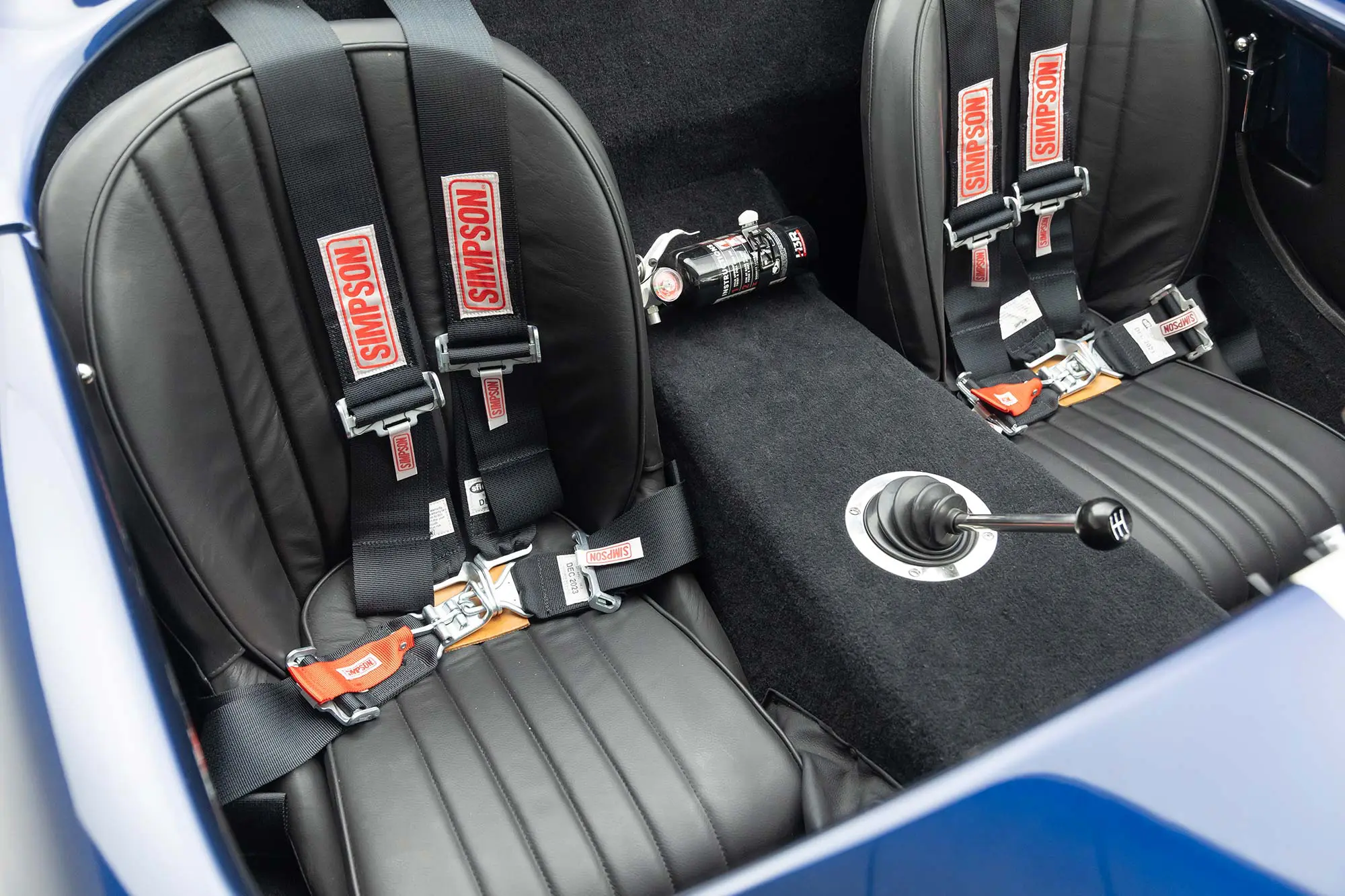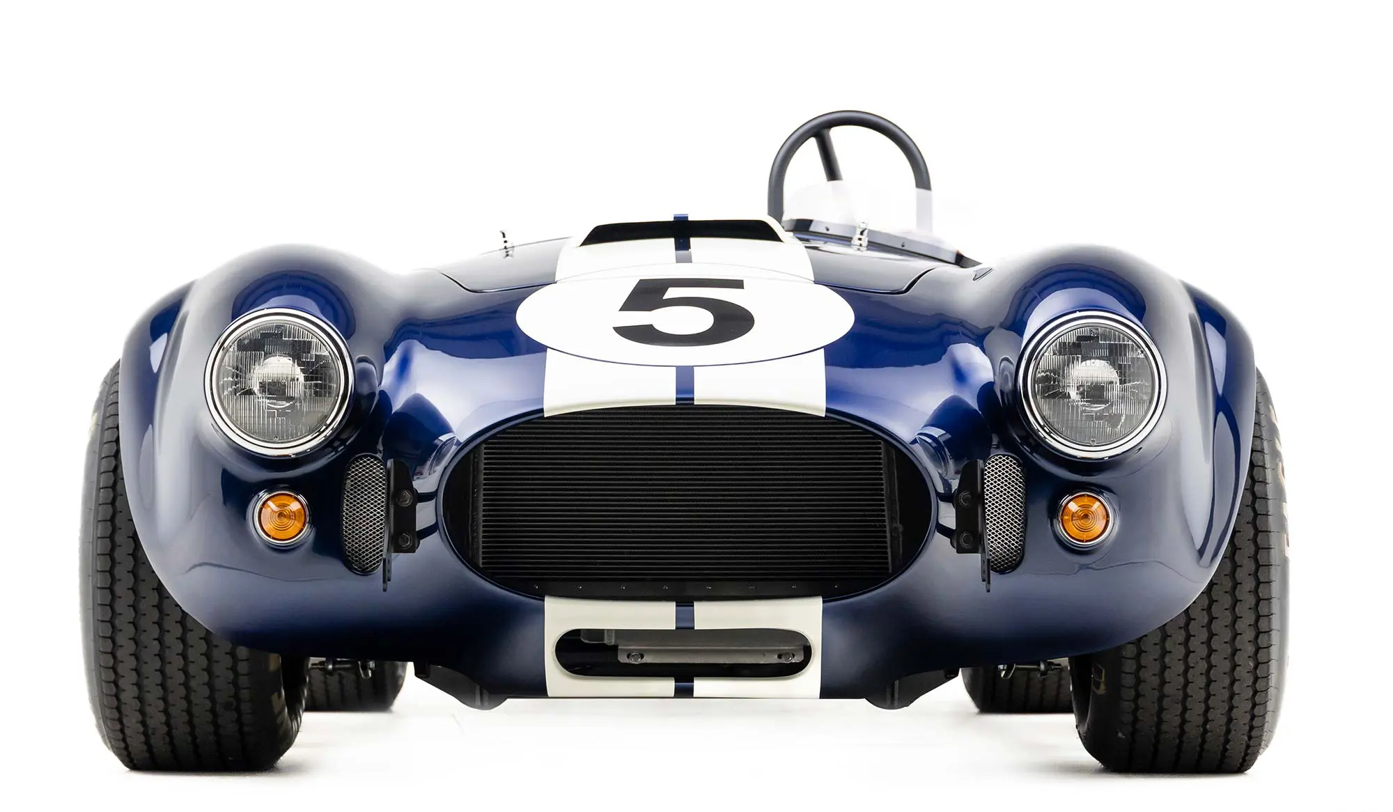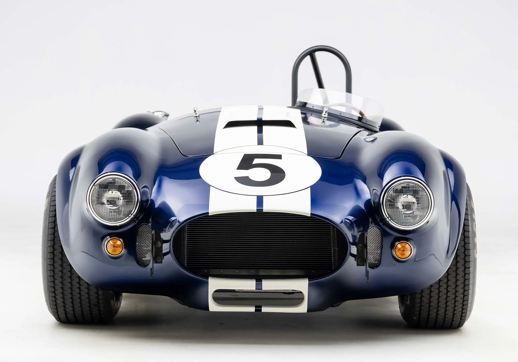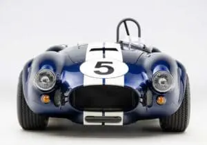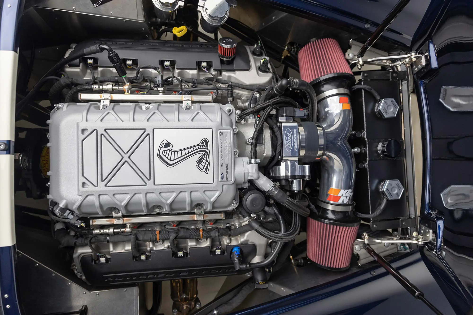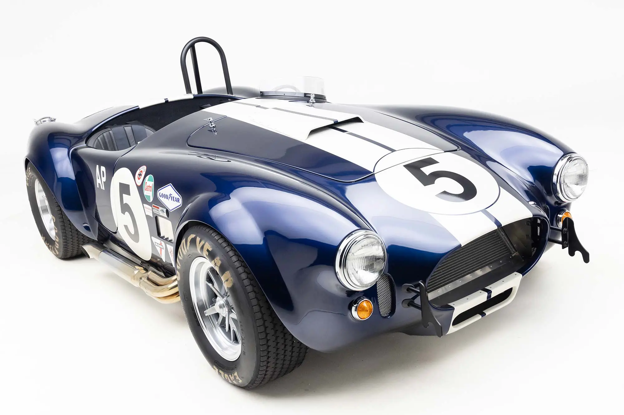 This Mk4 Roadster was featured at the 2022 SEMA Show, and uses a 750 HP Ford Predator engine. The Predator is the same 5.2L supercharged engine that powers the current Ford GT500. The car has modest options which include IRS, vintage 15″ Halibrand wheels and period-correct Goodyear tires, Factory Five vintage gauges, standard interior, and deep blue paint with Wimbledon white vintage stripe/gumballs.