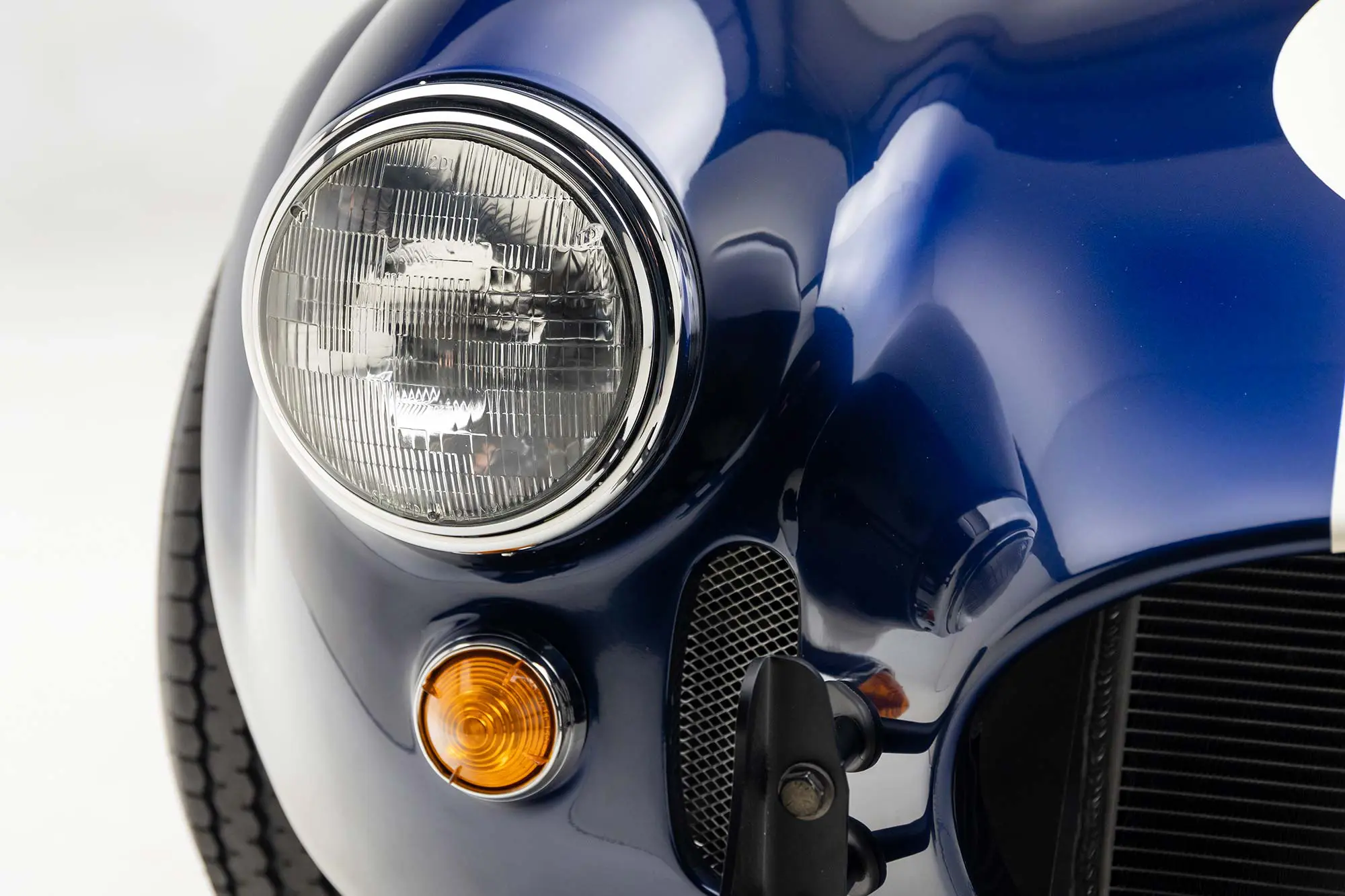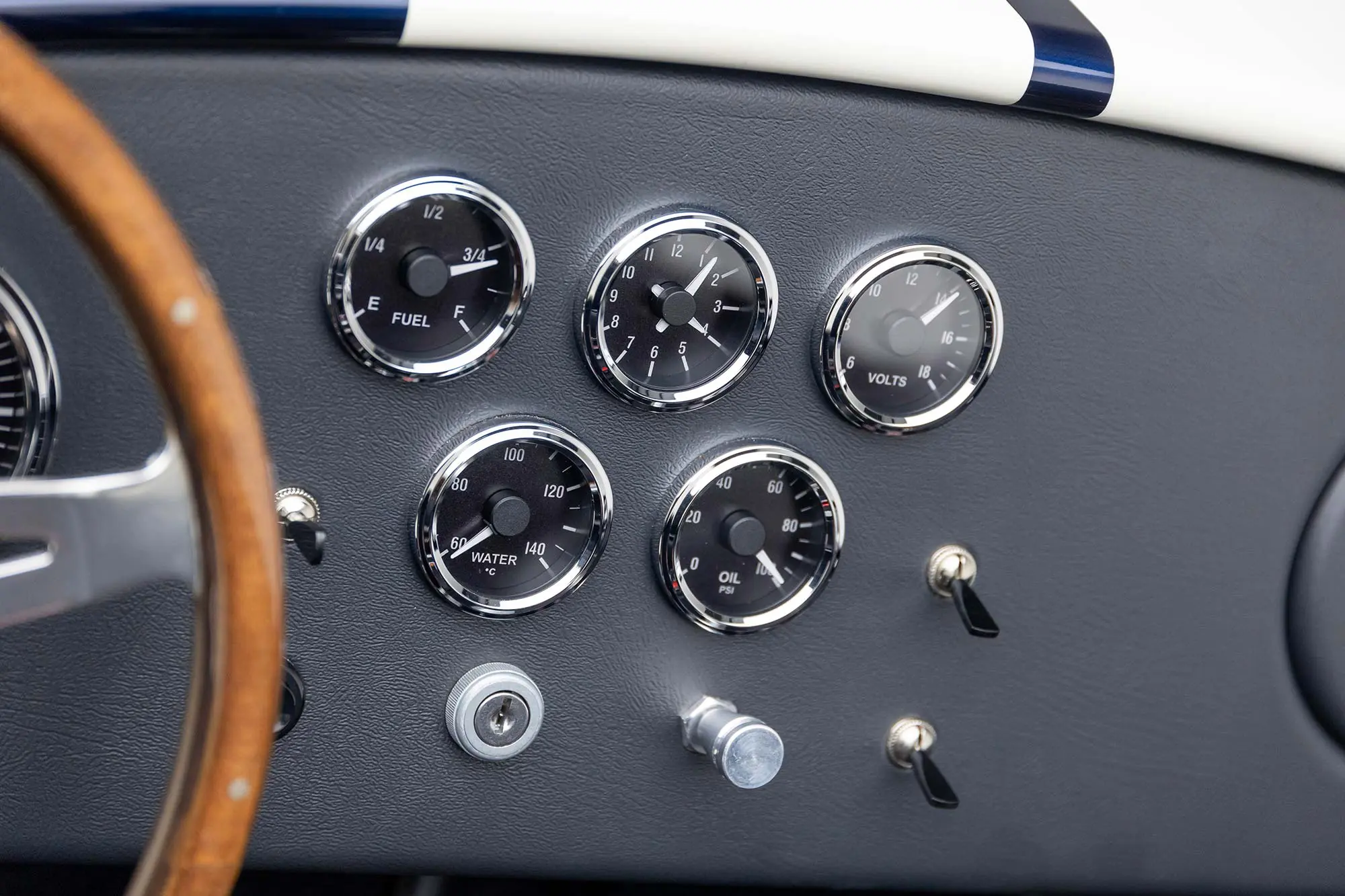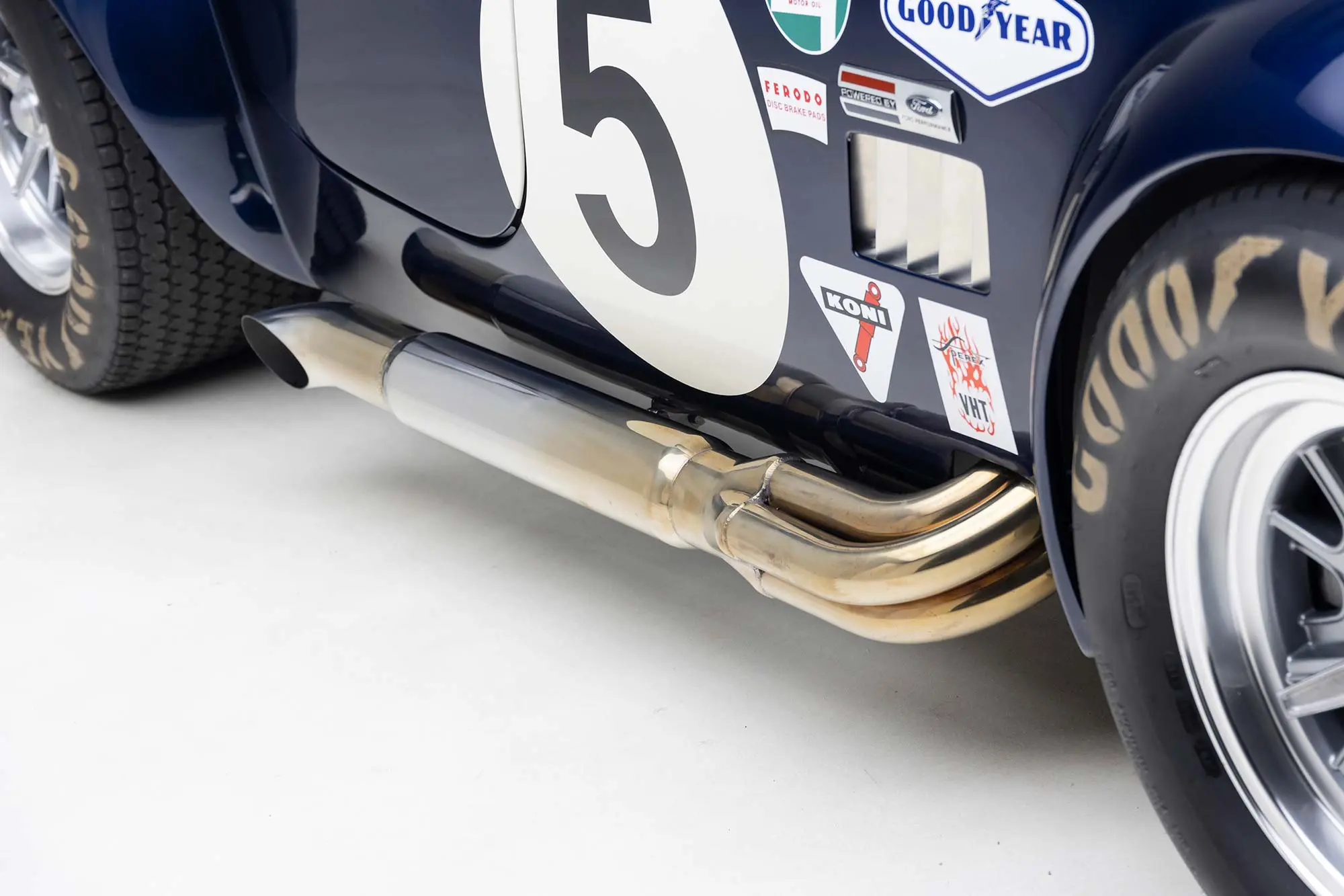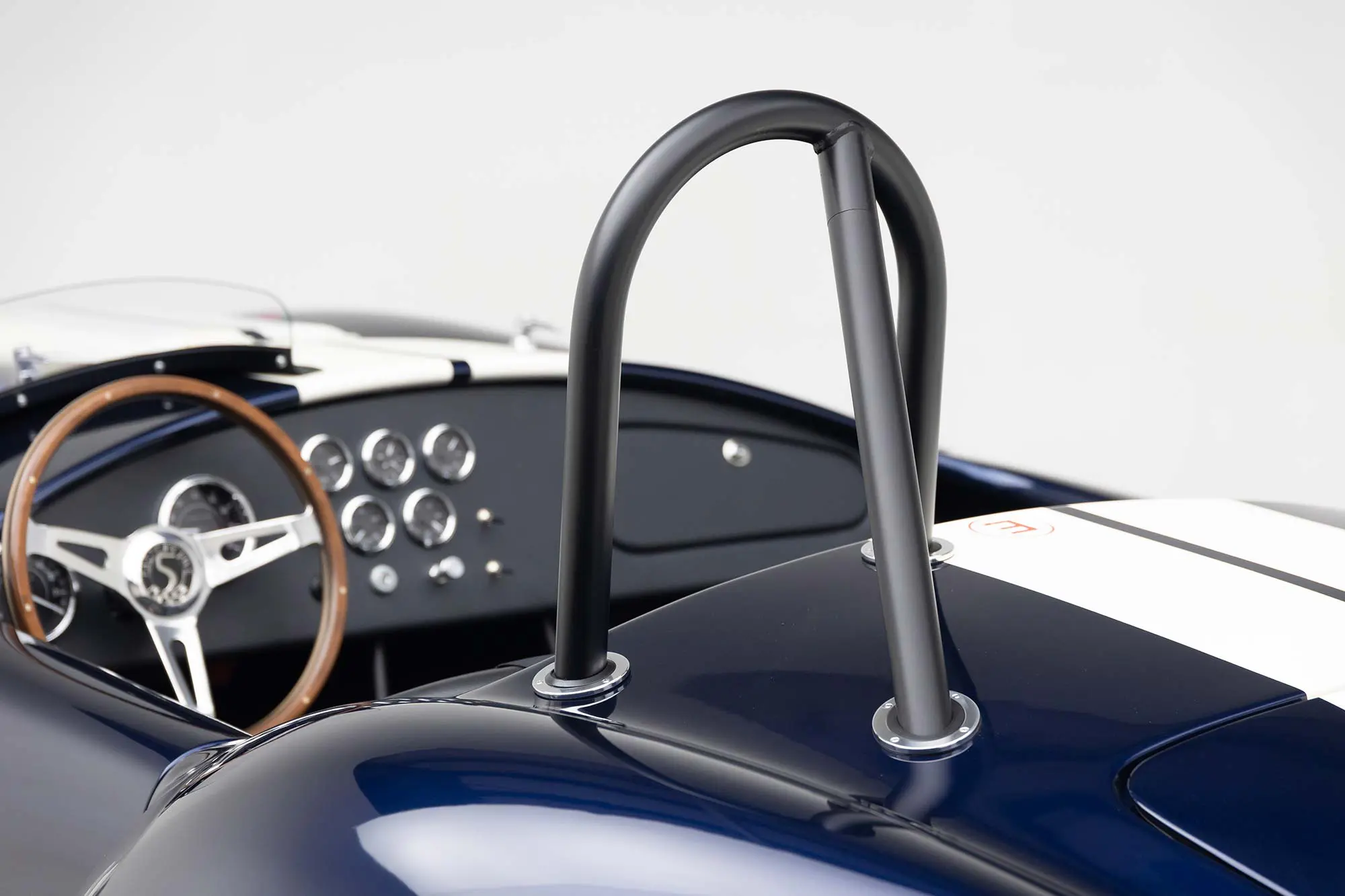 This Mk4 Roadster was featured at the 2022 SEMA Show, and uses a 750 HP Ford Predator engine. The Predator is the same 5.2L supercharged engine that powers the current Ford GT500. The car has modest options which include IRS, vintage 15″ Halibrand wheels and period-correct Goodyear tires, Factory Five vintage gauges, standard interior, and deep blue paint with Wimbledon white vintage stripe/gumballs.