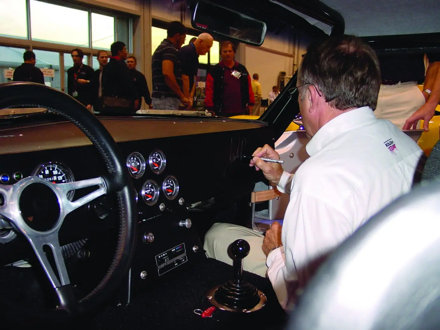 Jack Roush signs the dash of the Factory Five-Ford Champ Car Coupe.